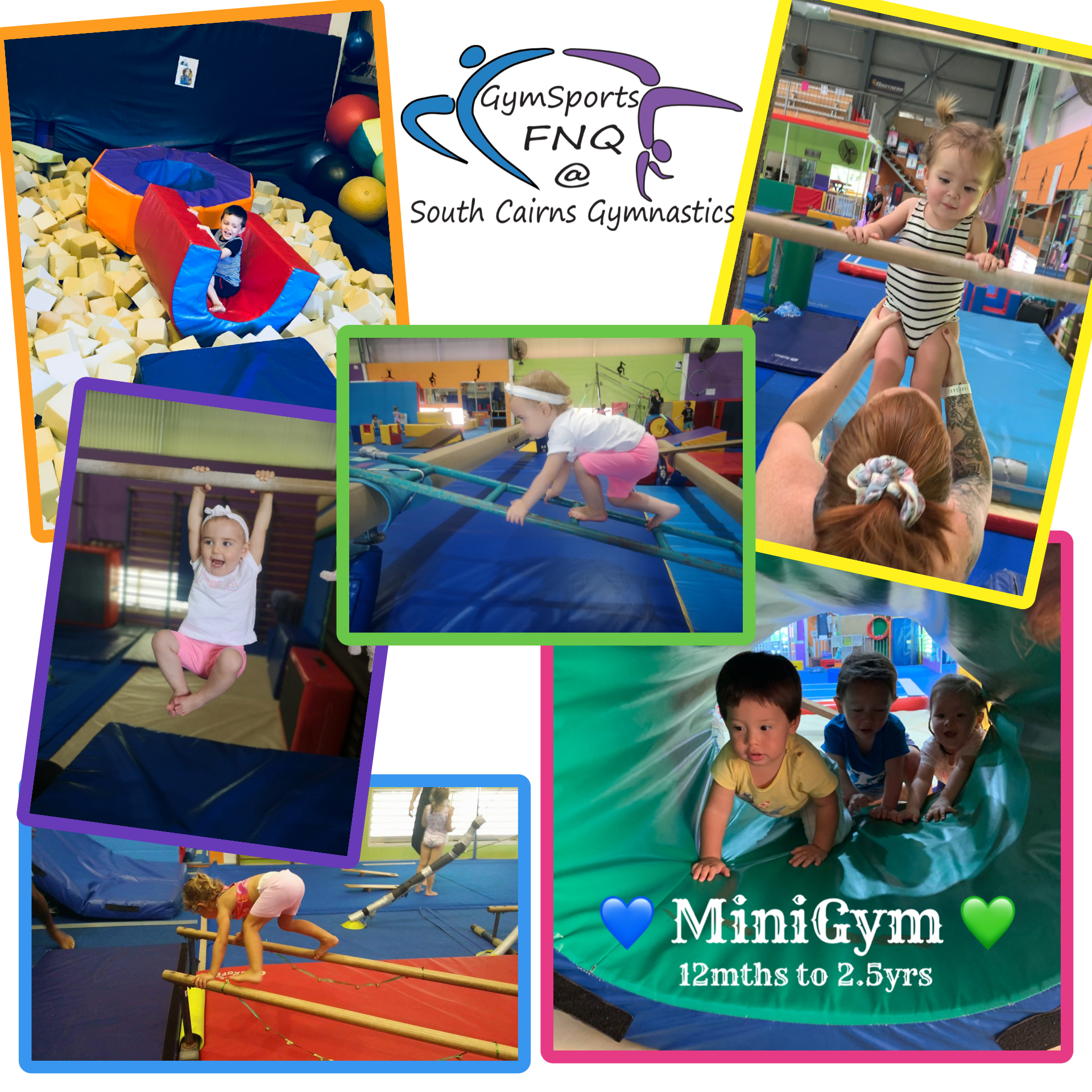 Our themed classes create a fun & colourful experience in our gymnasium while developing children’s physical abilities, build self-confidence while learning basic locomotor skills as well as balance, coordination and social interaction in a positive and encouraging environment. You will be amazed to watch your little ones learn as they swing, jump, bounce & climb through our challenging gymnastic circuits. Our Kindergym classes require full adult participation in the class. Caregivers play a vital role in providing their child the security to explore these activities and it’s also a great opportunity to take the time out of your busy life (off your phone) and come and have some interactive fun with your child.
